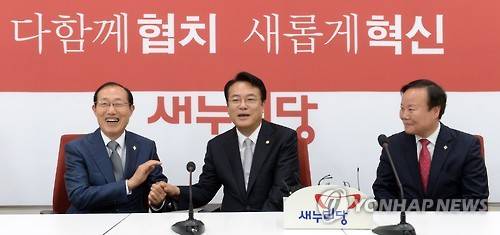 (서울=연합뉴스) 배재만 기자 = 새누리당 정진석 원내대표(가운데)가 14일 오전 취임 인사차 방문한 이원종 대통령 비서실장을 만나 손을 잡은 채 얘기를 나누고 있다. 오른쪽은 김재원 정무수석. 2016.6.14