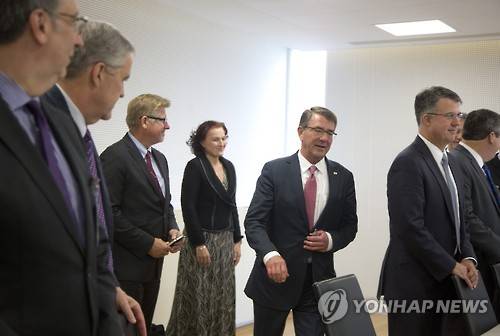 epa05363760 US Secretary of Defense Ashton Carter (C) prepares to take his seat prior to a meeting with NATO Secretary General Jens Stoltenberg (unseen) prior to a meeting at the North Atlantic Treaty Organization (NATO) headquarters in Brussels, Belgium, 14 June 2016. Others are not identified. NATO countries' Defence ministers are expected to agree to send four multinational battalions to the Baltic states and Poland to boost their defenses against Russia. EPA/VIRGINIA MAYO / POOL
