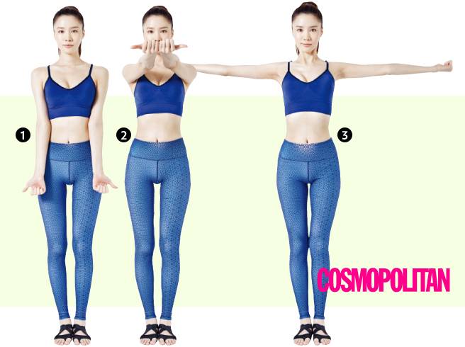 STANDING CHEST FLY 1. 양손을 엄지만 펴 팔목이 앞을 향하도록 허벅지 앞에 놓는다.2. 숨을 들이마시면서 양팔을 천천히 직각으로 들어 올린 뒤 양손을 맞댄다. 이때 허리는 곧게 편 상태를 유지할 것.3. 양팔을 천천히 좌우로 펼친다. 가슴을 최대한 활짝 열며 날개뼈 부위의 근육을 쪼인 뒤 2·1번 자세 순서로 복귀.