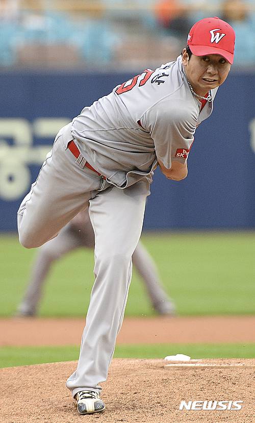 【대구=뉴시스】최진석 기자 = 16일 오후 대구 수성구 야구전설로 삼성라이온즈파크에서 열린 2016 타이어뱅크 KBO리그 SK 와이번스와 삼성 라이온즈의 경기, 삼성 2회말 SK 선발투수 윤희상이 역투하고 있다. 2016.06.16.