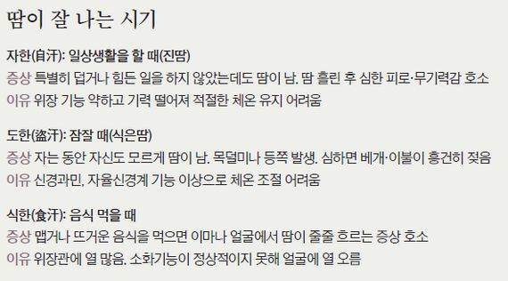 땀은 때때로 심리 상태를 보여주는 거울 역할을 한다. 슬프거나 화가 났을 때, 스트레스를 받거나 긴장했을 때 교감신경이 흥분하면서 땀이 난다. 가천대 길병원 가정의학과 고기동 교수는 “적절한 땀 분비는 사람이 살아가는 데 반드시 필요한 생리현상”이라며 “너무 심하거나 부족할 때 건강 문제를 유발할 수 있다”고 말했다.