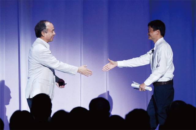 2014년 7월 일본 도쿄에서 열린 소프트뱅크 월드 2014 행사에서 손정의 소프트뱅크 회장(왼쪽)과 마윈 알리바바 회장(오른쪽)이 악수하려 다가가고 있다. <사진 : 블룸버그>