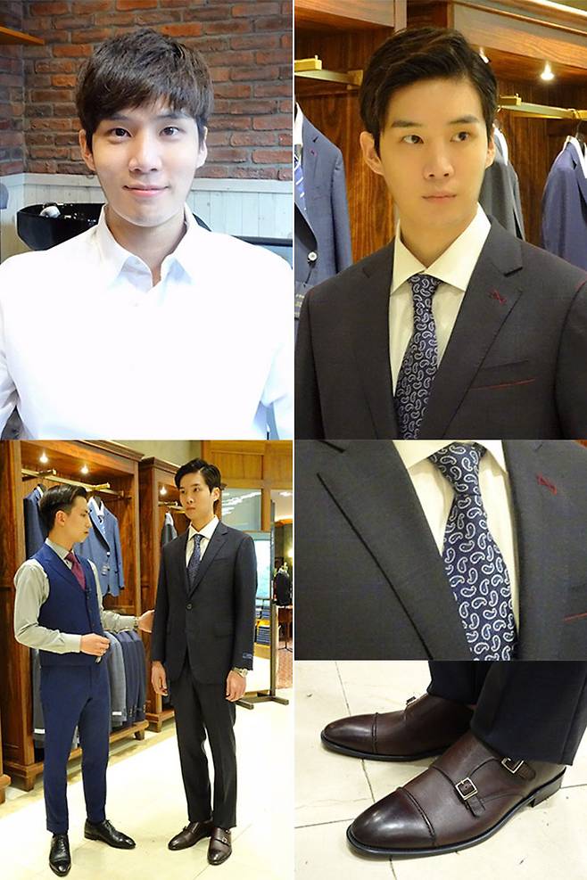 홍승휘는 곧바로 캠브리지멤버스 측에서 제공한 정장을 착용했다. 눈에 띄지 않는 체크무늬 스타일로 세련미를 강조한 핏에 네이비 색상의 타이와 브라운 슈즈로 마무리하니 포마드 헤어스타일과 완벽하게 믹스매치 되어 뉴클래식한 남성 스타일을 완성할 수 있었다.