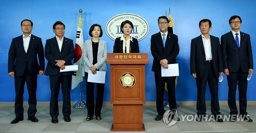 (서울=연합뉴스) 홍해인 기자 = 2017년도 최저임금 결정 시한을 하루 앞두고 국회 환경노동위원회 더불어민주당 간사인 한정애 의원(가운데)을 비롯한 더민주 환노위 소속 의원들이 27일 오전 서울 여의도 국회 정론관에서 기자회견을 하고 있다.
