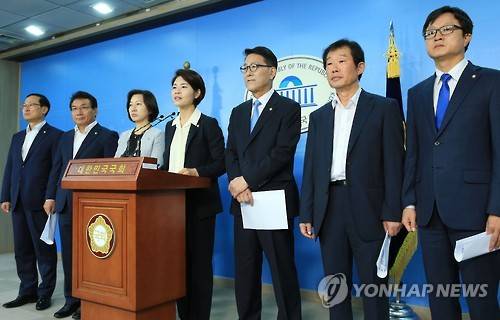 (서울=연합뉴스) 홍해인 기자 = 2017년도 최저임금 결정 시한을 하루 앞두고 국회 환경노동위원회 더불어민주당 간사인 한정애 의원(가운데)을 비롯한 더민주 환노위 소속 의원들이 27일 오전 서울 여의도 국회 정론관에서 기자회견을 하고 있다.