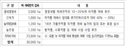 자연 감소분을 포함해 벼 재배면적 3만㏊를 올해부터 3년간 지속적으로 줄이고 논에 다른 작물 재배를 유도하는 등 생산조정제를 시행하고 있다.