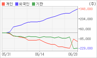 | 기관과 개인은 순매도, 외국인은 순매수(한달누적) 6월27일부터 전일까지 외국인이 2거래일 연속 순매수를 보였다. 4주간을 기준으로 보면 외국인이 초반에 동종목을 순매수한 이후에 기세를 이어가며 347,896주를 순매수한 반면, 기관은 매도 관점으로 접근하면서 224,180주를 순매도했고, 개인들도 초반에 동종목을 순매도한 이후에 근래에는 순매도량을 줄이면서 123,716주를 순매도한 것으로 집계됐다. |