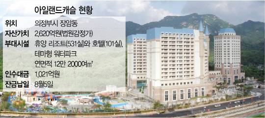 아일랜드캐슬은 콘도 531실, 호텔 101실, 워터파크 등 연 면적 12만2,000여㎡의 도심형 복합 리조트로 지난 2009년 11월 준공됐다. 롯데건설이 1,250억원대의 공사대금을 받지 못해 유치권을 설정한 후 7년째 개장을 못한 채 표류해왔다. 준공 초기에는 수도권에 드문 복합리조트라는 점에 주목을 받았지만 시행사와 위탁사 등의 복잡한 채권·채무 문제가 풀리지 않았다. 더구나 서울 근접성을 내세운 도심형 리조트를 앞세웠지만 정작 접근성이 떨어져 회원제 분양도 실패하며 관광도시전략을 내세운 의정부시조차 풀어야 할 숙제가 됐다.