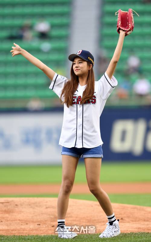걸그룹 라붐의 솔빈이 30일 잠실구장에서 열린 2016 KBO리그 두산과 넥센의 경기에 앞서 시구를 한 뒤 관중석을 향해 인사를 하고 있다. 이날 시타는 라붐의 멤버 율희가 맡았다. 2016. 6. 30.