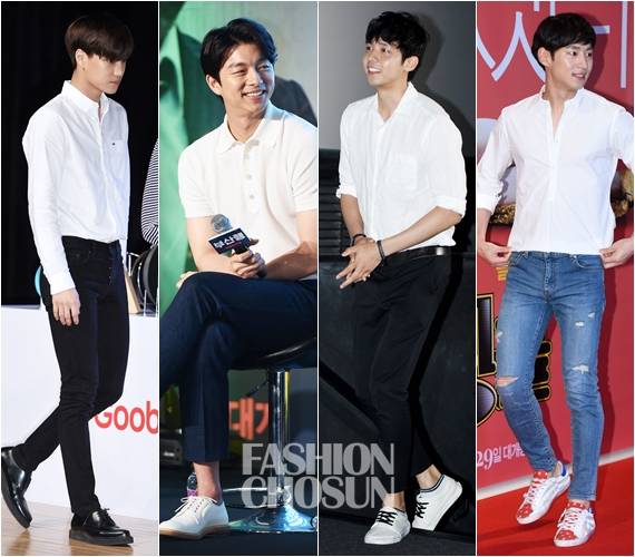 화이트 PK셔츠와 네이비 슬랙스 팬츠로 모나미룩을 연출한 공유. 여기에 화이트 옥스퍼드화를 더해 군더더기 없는 완벽한 시즌룩을 완성했다. 역시 패션의 완성은 비율.
