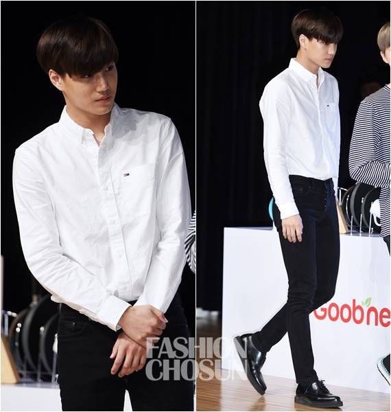 퍼펙트보디의 카이. 심플한 모나미룩만으로 여심을 제대로 저격했다. 셔츠와 팬츠 모두 타이트하게 연출해 슬림한 그의 보디를 더욱 돋보이게 만들었다.