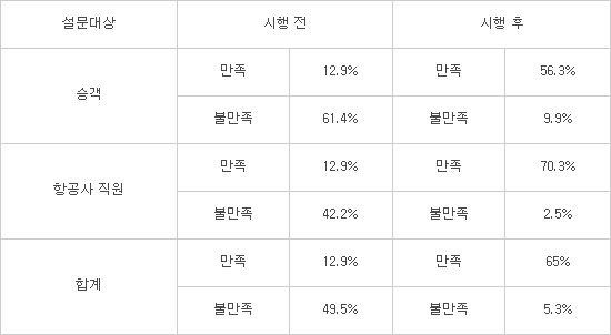 그동안 보안검색 완료구역에서 구매한 음료도 엄격한 국제선 액체류 통제로 인해 항공기 탑승 전에 폐기해야 해 승객이 불편했고 항공사도 승객과 잦은 마찰로 어려움을 겪었다. 승객과 항공사 직원 만족도는 시행 전 각각 12%로 매우 낮은 수준이었으나 제도 개선 후 각각 56%와 70%로 개선됐다.