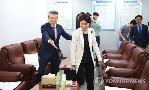 (세종=연합뉴스) 안정원 기자 = 국회 환경노동위원회 소속 더불어민주당 한정애 의원이 4일 오후 정부세종청사 고용노동부 최저임금위원회를 방문, 박준성 위원장으로부터 자리를 안내받고 있다. 2016.7.4
