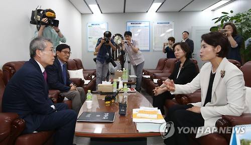 (세종=연합뉴스) 안정원 기자 = 국회 환경노동위원회 소속 더불어민주당 한정애.송옥주 의원(오른쪽부터)이 4일 오후 정부세종청사 고용노동부 최저임금위원회를 방문, 박준성 위원장과 대화하고 있다.