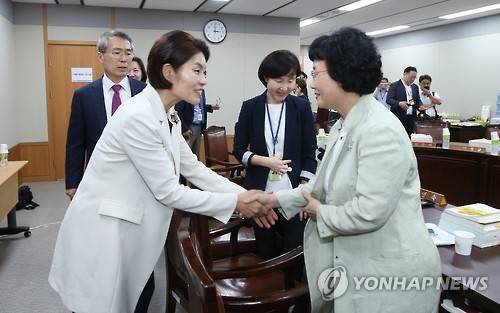 (세종=연합뉴스) 안정원 기자 = 국회 환경노동위원회 소속 더불어민주당 한정애 의원(왼쪽)이 4일 오후 정부세종청사 고용노동부에서 열린 최저임금위원회 제8차 전원회의장을 방문, 공익위원들과 악수하고 있다. 2016.7.4
