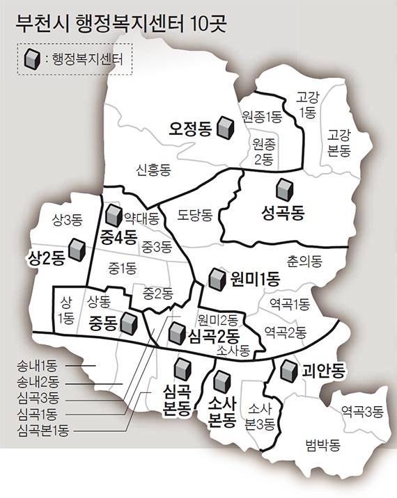 부천시는 이날부터 기존에 있던 원미·소사·오정구 등 3개 구를 없앴다. 대신 36개 동(洞) 주민자치센터 중 10곳을 행정복지센터로 지정해 구청 등에서 담당하던 업무를 맡겼다. 나머지 동 주민자치센터는 지금과 같은 역할을 한다.