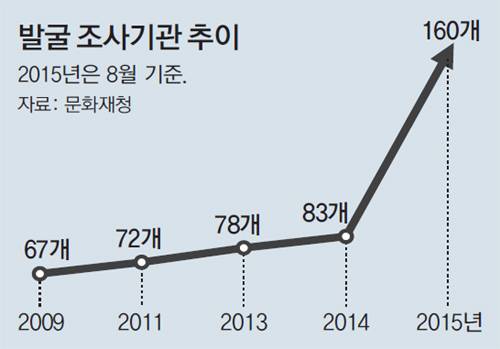 이에 따라 업체 간 경쟁이 치열해지면서 이른바 ‘발굴 단가 후려치기’가 본격화되고 있는 형국이다. 실제로 2011∼2013년 표준품셈(정부가 고시하는 적정 발굴 비용) 대비 실제 발굴 비용은 공공시행 사업 79%, 민간시행 사업 58%로 조사됐다. 통상 발굴법인이 최소한의 이윤을 내려면 이 수치가 70∼80%는 돼야 한다. 민간 시행 사업의 경우 발굴법인이 밑지는 장사를 한 셈이다. 한 고고학계 관계자는 “발굴법인들이 손실을 내지 않기 위해 조사 인원이나 기간을 줄이면 발굴은 부실해질 수밖에 없다”고 말했다.