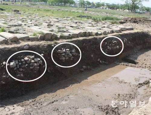 | 올 4월 경북 경주시 황룡사지 역사문화관 불법 공사로 파괴된 통일신라시대 건물 유적. 굴착기로 구덩이를 파면서 적심석(원으로 표시된 곳)이 잘려나갔다. 동아일보DB |