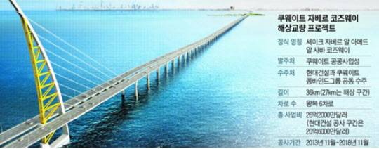 문제의 현장은 현대건설이 2012년 11월 20억6000만달러(약 2조3700억원)에 수주한 쿠웨이트 자베르 코즈웨이 해상교량 공사 현장이다. 이 교량은 쿠웨이트만(灣)을 가로지르는 36㎞짜리 세계 최장 해상교량으로, 박근혜 대통령이 작년 3월 방문, 방명록에 ‘자베르 코즈웨이가 쿠웨이트와 한국을 잇는 우정의 가교가 되길 바랍니다’라고 적기도 했다.