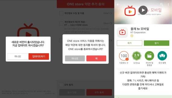 | ▲올레tv모바일을 실행하면 업데이트가 필요하다는 안내(왼쪽)가 나오고 안내에 따르면 원스토어로 자동 연결된다. 원스토어에 가입하지 않으면 업데이트가 불가능(가운데)하다. 우측은 구글 플레이스토어에서 올레tv모바일을 검색한 화면으로 업데이트 버튼이 활성화되지 않는다. |