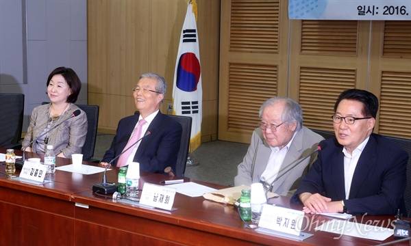 | ▲ 6일 오전 국회 의원회관에서 열린 '따뜻한 미래를 위한 정치기획' 창립기념식에서 김종인 더불어민주당 비대위대표, 박지원 국민의당 비대위원장, 심상정 정의당 대표가 참석해 축사를 했다. 이날 남재희 전 노동부장관은 '빈곤, 비례대표제 그리고 개헌'을 주제로 특강을 했다. |