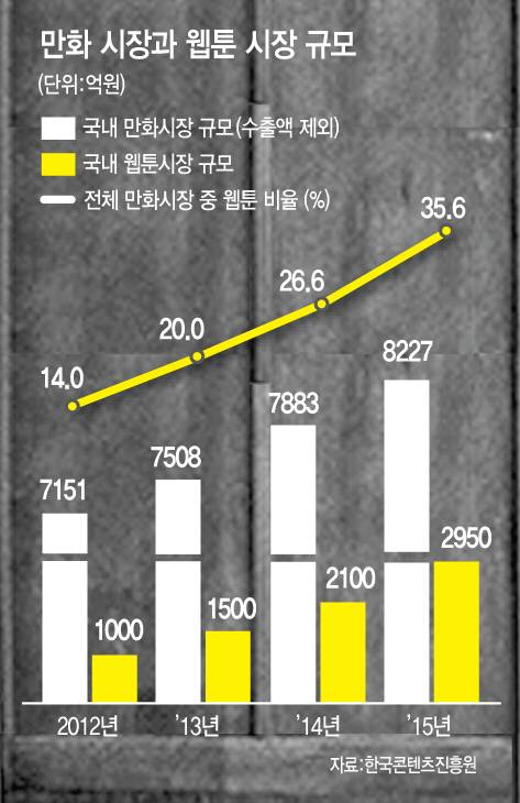 [이데일리 김현아 오희나 기자] 한국웹툰의 성장비결에는 앞선 IT인프라가 있다. 디지털 만화라 불리는 웹툰의 1세대는 PC 화면에 만화책을 스캐닝해 집어넣은 개념이었다. 그림파일 방식(JPG)을 써서 개념적으로는 책의 화면구성과 동일했다.