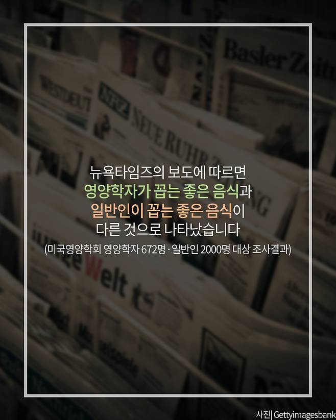 미국 매체 뉴욕타임즈따르면 영양학자와 일반인들이 인식하는 건강에 도움되는 음식이 다르게 나타났다고 합니다.