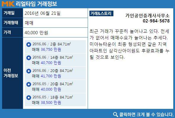 10일 부동산 업계에 따르면 가인공인중개사는 지난달 21일 강북구 삼각산아이원아파트 전용면적 84.71㎡(약 25.6평) 20층 매물을 4억원에 매매 계약했다. 국토교통부 실거래자료를 기준으로 가장 최근 거래 건은 지난달에 신고 된 2층 매매가 3억6750만원이다.