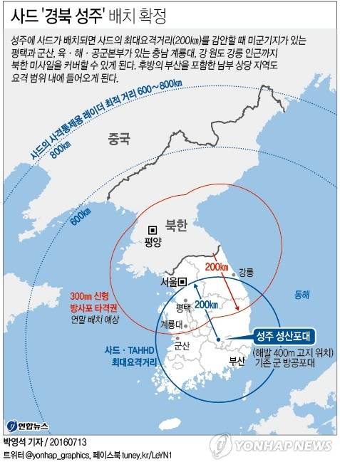 지역방어시스템인 사드의 방어 영역은 전방 200㎞ 반경과 후방 100㎞ 반경을 아우른다. 이 범위에서 사드의 요격고도인 40∼150㎞ 범위에 들어오는 북한의 탄도미사일은 모두 요격 대상이 된다.