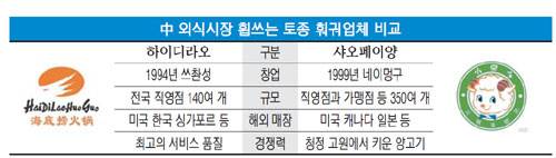 하이디라오와 샤오페이양은 여기에 더해 남들과 다른 차별화된 가치를 제공해 훠궈 시장의 양강으로 자리 잡았다. 1994년 쓰촨성 젠양시에서 창업한 하이디라오는 지난해 말 기준 중국 내 매장 수가 140여 개까지 늘었다. 2년 만에 60% 증가할 정도로 폭발적인 성장세다. 미국 싱가포르 한국 등 해외에서도 매장을 확대하고 있고, 지난해 연간 매출은 무려 30억위안(약 5200억원)에 달한다. 하이디라오의 경쟁력은 서비스에서 나온다. 중국에서 유명한 맛집이라고 찾아가보면 종업원들의 성의 없는 태도에 당황하는 경우가 많다. 한국에서처럼 '손님은 왕'이라고 소리라도 질렀다가는 낭패당하기 십상이다.