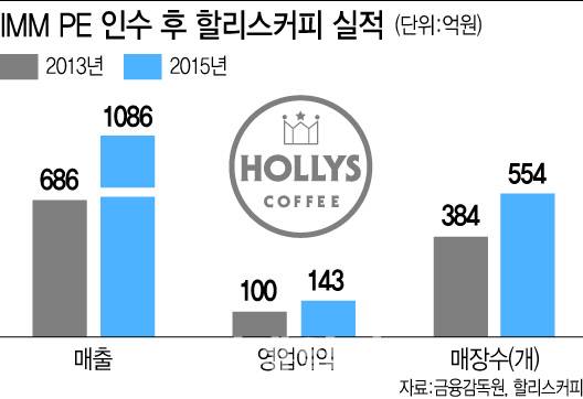 실제 IMM PE는 지난 2013년 할리스커피를 인수한 이후 추가 지분 매입 등을 통해 총 820억원(지분율 91.82%)을 투자했으며 성공적인 사업 확장을 위해 직영점 확대에 주력했다. 현재 전국 560여개 매장중 직영점 비율은 20%로 앞으로 더 늘린다는 계획이다. 직영점 확대와 디초콜릿커피사업부 인수, 할리스커피클럽 등 새 브랜드 론칭 등은 곧바로 매출 증대로 이어졌다. 지난해 할리스에프앤비 매출액은 1086억원, 영업이익은 68억원으로 전년동기대비 각각 35.2%, 23% 증가했다. EBITDA 기준으로는 지난해 142억원을 기록해 같은 기간대비 약 40% 늘었다. 올 상반기 기준 EBITDA는 200억원을 넘어선 것으로 파악된다. 여기에 160억원 가량의 현금보유대비 차입금은 60억원에 불과해 무차입 경영이 지속되고 있다는 점도 장점으로 꼽힌다.