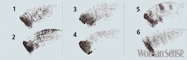 1위 미샤 땅콩 모양의 브러시가 눈머리부터 눈꼬리까지 한 번에 컬링한다. 2위 보브 그립감이 뛰어난 커브 형태의 브러시. 눈 주위에 번지지 않고 고르게 발린다. 3위 바닐라코 브러시가 가볍고 여우 꼬리처럼 굴곡이 있어 눈머리의 짧은 속눈썹에도 잘 발린다. 4위 바비 브라운 마스카라액이 브러시에 일정하게 묻어나와 속눈썹 가닥마다 정교하게 발린다. 5위 오휘 속눈썹 모양과 닮은 커브형 브러시가 자연스럽게 속눈썹을 감싸 사용이 편리하다. 6위 스킨푸드 콤팩트한 C컬 브러시라 마스카라액이 뭉침 없이 촘촘하게 발린다. TEST 2 브러쉬A4 용지에 마스카라를 일정한 방향으로 그어 묻어나는 마스카라액의 양과 컬러를 확인했다.