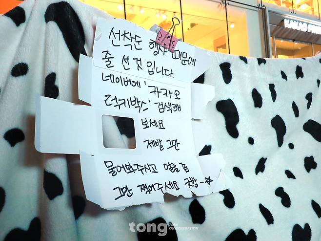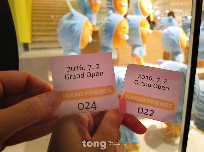 1시간 30분의 기다림 끝에 카카오프렌즈샵 입성카카오프렌즈샵에 입성하자 천국에 온 것만 같습니다.(덕통사고 주의) 통이 최애 라이언이 눈앞에 샤샤샤~~~ 대형 피규어에 눈이 뱅글뱅글~~~ 각종 상품들을 구경하고 사진 찍느라 정신없었습니다. 1층엔 각종 인형과 문구, 슬리퍼, 모바일 용품이 2층엔 골프공, 노트북 가방, 생필품이 있습니다.(통이 잠옷 사주뗴염♡) 3층엔 그 인기를 증명하듯 라이언 카페가 자리하고 있었습니다.(편애 쩐다잉~~) 라이언 마카롱을 보며 침을 흘리고 있는데 밖이 심상치 않아 보였습니다. 뭔가 이상한 촉을 느끼고 매장 밖으로 달려갔습니다.오후 7시 37분, 럭키박스 임시줄이 생긴 겁니다. 사람들이 점점 모여들고, 자연스럽게 줄이 생성된 거죠. “번호표는 9시 이후에 나눠주지만 미리 줄을 서는 건 막지 않을게요. 하지만 주변 상점에서 항의가 들어오면 언제든지 줄은 해체될 수 있어요.” 직원들이 경고했습니다. 럭키박스를 위한 기다림은 시작됐습니다. 100명은 금세 채워졌습니다.(게임 끝!) 오후 9시에 럭키박스 번호표를 받았습니다. 통이는 22번!(크..눙물이) 동물원 속 원숭이처럼 바리케이드 안에서 인내의 시간이 계속됩니다.밤 10시, 카카오프렌즈샵 문도 닫혔습니다. 럭키박스 동지들은 돗자리를 깔고 바리케이드 주변을 담요로 가리며 우리만의 성벽을 쌓았습니다. 불금 강남역 한복판에서 지나가는 사람들의 시선을 피하려면 어쩔 수 없었습니다. 시험 문제 맞혀보는 고등학생, 여자 친구를 위해 온 남자들, 친구끼리 온 사람 등 다양한 사람들이 럭키박스를 기다리고 있었습니다. 그들은 저마다의 방법으로 기다림의 시간을 보냈습니다. 영화를 보거나 잠을 자기도 하고 노래를 부르기도 했습니다. 혼자 온 사람들도 어느새 주변 사람들과 친해져 같이 치킨을 시켜 먹기도 했죠. 같은 목표를 향해 달려가는 동지의식, 전우애가 느껴지는 순간이었습니다.밤 12시부터는 두 시간 간격으로 아침 10시까지 출석체크 시간이 있었습니다. 출석체크 시간에는 자는 사람도 깨웠습니다. 출석체크 때 빠진 사람이 있으면 순번을 앞으로 당긴다고 했죠. 하지만 이탈자 O명!(대.다.나.다.너) 럭키박스에 대한 염원은 이렇게 크고도 크며 컸습니다. 물론 직원들에게 말하고 잠깐 화장실을 다녀오거나 밥을 먹고 오는 건 허용됐습니다.(다 먹고살자고 하는 거 아니겠어유?) 통이는 햄버거, 컵라면, 아이스크림, 젤리 등을 시간대별로 섭취했습니다.(잠 오는 건 참아도 배고픈 건 못 참아! 데헷~)어느새 아침 해가 밝았습니다. 처음엔 해가 밝아서 기분이 좋았습니다. 하지만 곧 더위 엄습! 이때 모든 사람들의 휴대폰으로 폭염경보가 울렸습니다.(하... 쪄 죽는다는 게 이런 건가요?) 참을 인자 세 번이면 살인도 면한다는 심정으로 참고 또 참았습니다. 오전 8시부터는 돗자리를 접고 오로지 서서 기다려야 했습니다. 마침 럭키박스가 매장으로 배송왔습니다. 갈증이 더 커집니다.(조금만 기다려~~)오점 10시 29분 55초! 사람들은 카운트다운을 외쳤습니다. 10! 9! 8...5! 4! 3! 2! 1! 10시 30분, 드디어 카카오프렌즈샵은 다시 문을 열었습니다.(1분도 일찍 문을 열어주지 않았.. 융통성 대단합니다.)