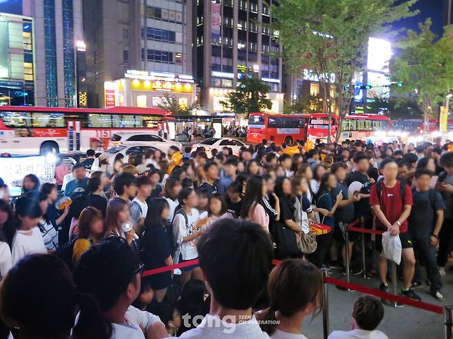 어느새 파고다어학원 매장이 보입니다. 이곳에서 직원이 도장을 찍어 줍니다. 이 뒤로는 줄을 세워주지 않고 근처 벤치에서 대기하다가 줄이 줄어들면 도장을 받으며 본격적인 줄 서기 시~작! 입장부터 고행 시작입니다. 꼬박 1시간 30분 기다려서 들어갑니다.(대.다.나.다.너)