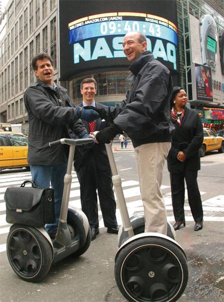 대중화에 실패했다. 사진 왼쪽부터 세그웨이를 발명한 딘 카멘과 베조스의 모습.