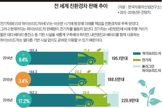 현대차 산하 한국자동차산업연구소 집계를 보면 2014년 기준 세계 친환경차 판매량 195만 1000대 가운데 하이브리드차가 165만4000대로 전체 판매의 84%를 차지했다. 전기차 판매량의 비중은 8.9%에 불과했다.