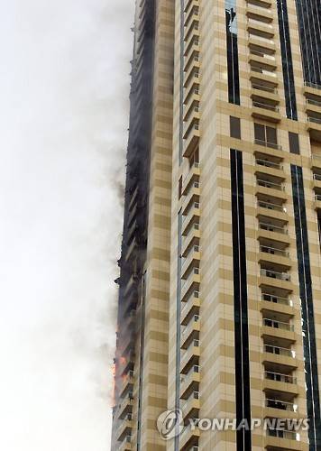 epa05433663 A general view for the al-Sulafa Tower skyscraper where a fire was blazed in the marina district of the Gulf Emirate of Dubai, United Arab Emirates, 20 July 2016. According to media reports a fire has broken out at the 35th floor of the 75 floor high building, firefighters evacuated the building and locked the area for three hours until the fire was contained. Around 30 floors were affected by the fire with no casualties reported. EPA/STR