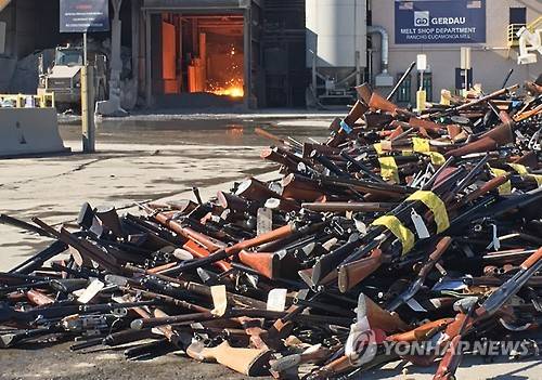 This photo provided by Gerdau Steel Mill shows some of more than 7,000 weapons seized or collected by the Los Angeles County Sheriff's Department, waiting to be melted down in a furnace, rear, in the agency's annual gun melt at Gerdau Steel Mill in Rancho Cucamonga, Calif., Thursday, July 21, 2016. The handguns, rifles and semi-automatic weapons were dumped into furnace at the mill, where they were melted down and will become reinforcing bars for use in construction. (Carlos Puma/Gerdau Steel MIll via AP)