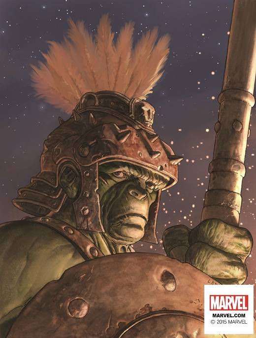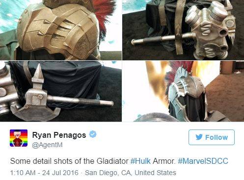 마블은 24일(현지시간) 샌디에이고 코믹콘에서 검투사 헐크(마크 러팔로)의 투구와 무기 등을 소개했다.