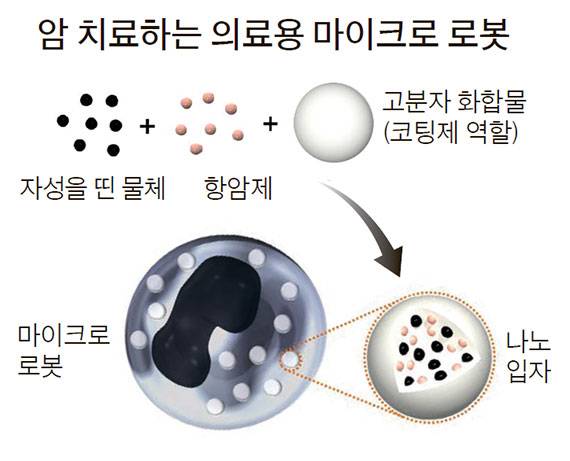 암을 치료하는 의료용 마이크로 로봇이 등장했다. 박석호 전남대 기계공학부 교수팀은 미래창조과학부 지원을 받아 대장암·유방암·위암·간암·췌장암을 치료할 수 있는 직경 20㎛ 크기(머리카락 굵기의 5분의 1) 초소형 로봇을 세계 최초로 개발했다고 26일 밝혔다. 이 로봇의 실체는 면역세포 중 하나인 ‘대식세포(macrophage)’다. 대식세포는 인체에 이물질이 들어오면 선봉대로 나서 세포를 잡아먹는 면역작용을 한다.이물질을 잡아먹는다는 특성을 이용해 연구진은 항암제를 넣은 나노 입자를 대식세포가 ‘잡아먹게’ 했다. 대식세포에 항암제를 집어넣은 셈이다. 이렇게 항암제를 먹고 배를 두드리는 대식세포에게 왜 ‘로봇’이란 이름을 붙였을까. 리모컨으로 로봇의 팔·다리를 조작하는 것처럼 대식세포도 컨트롤할 수 있는 기술을 확보했기 때문이다. 여기서 리모컨 역할을 하는 게 자기장이다.