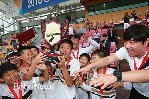 2016 Js cup U-12 국제유소년축구대회 폐회식에서 스킬스톰 선수단과 감독이 우승트로피를 들고 환호하고 있는 모습. 이기태 기자 ⓒ베이비뉴스 |