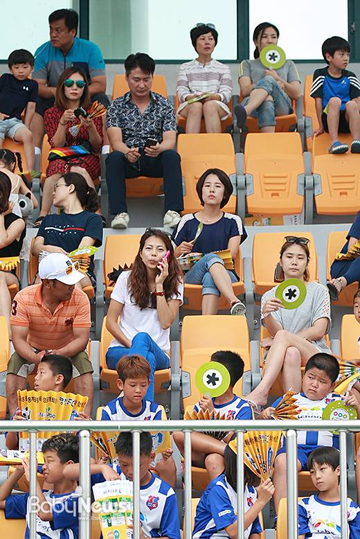 2016 Js cup U-12 국제유소년축구대회 결승전을 기다리며 선수단과 학부모들이더위를 쫓으려 부채를 사용하고 있다. 이기태 기자 ⓒ베이비뉴스 |