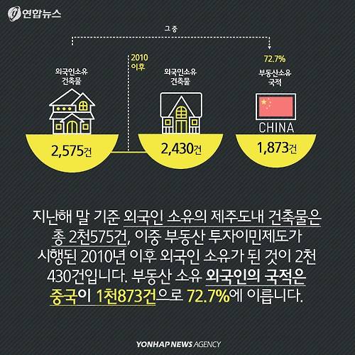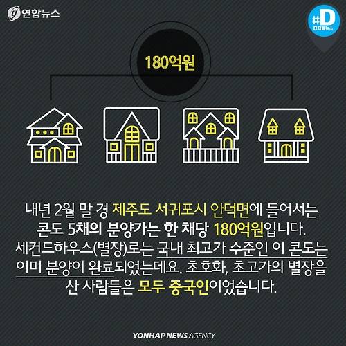 (서울=연합뉴스) 이상서 기자·김지원 작가·김동임 인턴기자 = 유럽풍 응접실과 방 7개, 거실 4개짜리 지상 2층 초호화 콘도미니엄. 1천500~1천600m² 부지에 지어지는 콘도 내부에는 서재, 드레스룸, 스파 기능 욕조 등이 구비되고 외부에는 300m² 내외의 정원이 만들어집니다. 바로 내년 2월말경 제주도 서귀포시 안덕면에 들어서는 콘도 5채 이야기입니다. 분양가는 한 채당 180억원. 세컨드하우스(별장)로는 국내 최고가 수준인 이 콘도는 이미 분양이 완료됐는데요. 초호화, 초고가의 별장을 산 사람들은 모두 중국인이었습니다. 어찌 된 일일까요.