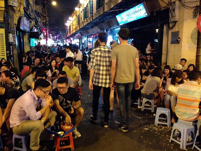| ▲ 하노이 '맥주 거리'. 태국 카오산로드는 명함도 못 내밀 인구 밀도를 자랑한다. 목욕탕 의자에 앉아 기울이는 맥주 한 잔. |