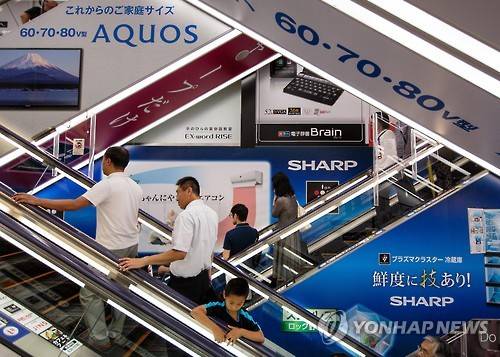 epaselect epa05446979 Customers ride the escalator surrounded by Sharp advertisements inside an electronics store in Tokyo, Japan, 29 July 2016. Sharp Corp. announced a 2.52 billion yen (around 24.3 million US dollars) operating loss in April-June quarter primarily due to poor performance of its LCD display business. EPA/CHRISTOPHER JUE