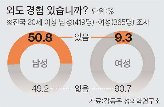 한국 남성의 과반수가 외도를 경험했다는 연구 결과가 31일 나왔다. 강동우 성의학 연구소가 라이나생명과 함께 여론조사기관인 리서치앤리서치에 의뢰해 지난 6월 전국 20세 이상 성인 남녀 1090명을 대상으로 조사 했다. 설문에 응답한 남성 419명 중 50.8%가 외도 경험자였으며, 여성(설문 응답자 365명)의 경우 외도 경험 비율은 9.3%였다.남성은 30대(42.3%), 40대(48.4%), 50대(52.5%), 60대 이상(56.7%) 순으로 연령대가 높아질수록 외도율도 높아졌다. 강동우 소장은 “남성의 경우 40대 중반부터 남성호르몬이 줄어들면서 갱년기 증상을 보이는데 이때 심리적 공허감과 신체적 위축 현상이 나타난다”며 “이 시기가 되면 외도를 덜 하는 게 아니라 오히려 신기루가 있는 것처럼 배우자 이외의 사람을 찾는다”고 설명했다.