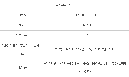 유영화학은 27년 동안 PVC 한 분야에만 사업영역을 집중했다. 자체 기술개발을 통한 특허 획득도 돋보인다. 2000년 기술혁신형 중소기업(INNO-BIZ) 선정에 이어 2009년 탄소섬유를 포함하는 폴리염화비닐수지관 특허, 2013년 아라미드섬유 보강 폴리염화비닐수지관 특허를 획득했다. 2014년에는 내충격성 PVC 상하수도관 조달청 우수제품 지정과 폴리염화비닐수지조형물 및 이로부터 제조되는 경질폴리 염화비닐관 제조방법 특허 획득 등에 성공했다.