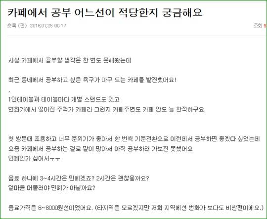최근 포털사이트 네이트판에 한 네티즌이 “카페에서 공부 어느 선이 적당한지 궁금해요”라는 제목으로 글을 올렸습니다(게시글 링크). 그는 자신의 동네에서 공부하고 싶은 욕구가 마구 드는 카페를 발견했다면서 진지하게 물었습니다.