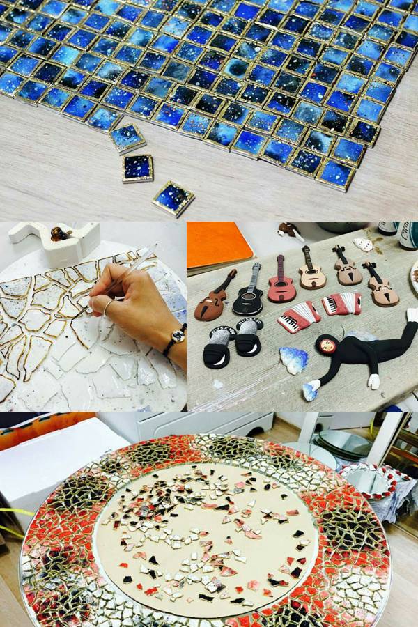 | ▲ 김씨가 처음 디자인한 메인작품 우주별 도자기(맨 위), 재벌작업 후 금칠하는 과정(가운데줄 왼쪽), 악기 브로치와 <제주해녀 바다이야기>작품에 들어갈 제주해녀 모형, 개인전에 전시할 작품 <상처>(맨 아래). |