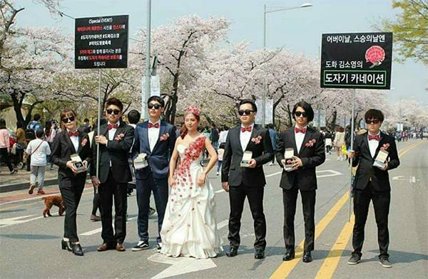 | ▲ 김씨가 직접 도자기 카네이션으로 온몸을 장식하고 거리에서 진행하는 파이오니어 퍼포먼스는 2012년 이후 매년 진행하고 있다. |